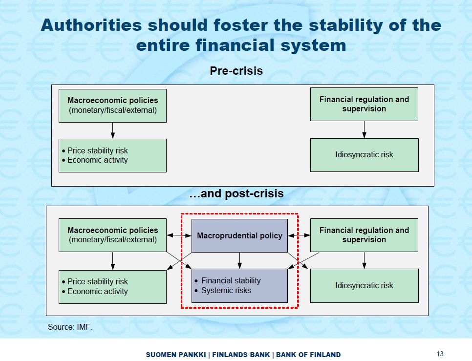 Erkki Liikanen, the Governor of the central bank of Finland, told us about his ideas to improve financial stability. Surprise: they haven’t changed. So macroprudential policy starts interfering with macroeconomic policies and financial regulation, with possibly opposite effects that don’t seem to bother him much. Look at that slide, which is the very definition of a messy policy goal, with multiple targets and interferences: