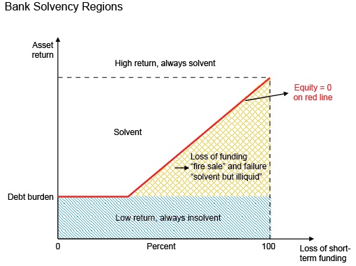 The first one, titled Stability of Funding Models: an Analytical Framework, is summarised through two different blog posts (here and here). The researchers present a banking model that graphically illustrates the factors that influence the risk of a bank becoming insolvent or illiquid (namely: low asset returns, high leverage, loss of funding (short-term debt maturity profile), asset encumbrance…).