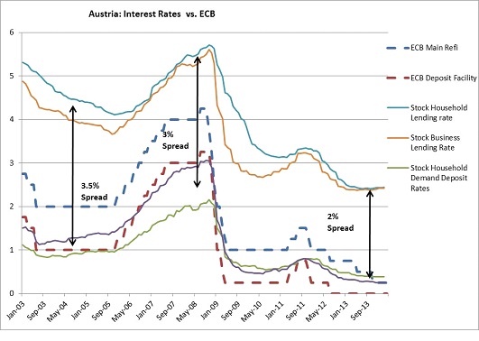 This is indeed what has been happening in Germany: banks have been cutting staff, deleveraging, and outsourcing expenses to low-cost countries. The spread between new lending rates and the ECB main rate has also remained consistently high since the rate cuts, and has even started to increase again following the most recent rate cuts (see below, blue arrows represent rate cuts, red arrows represent spread increases).