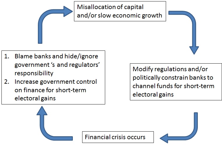 This, along with UK’s FLS and Help to Buy schemes, made me think that there has been a ‘political banking cycle’ throughout the 20th century. Why 20th century? From all the banking history I’ve read so far, populations seemed to better understand banking before the introduction of safety net measures such as central banks, deposit insurances or systematic government bail-outs. When financial crashes occurred, blame was usually shared between governments and banks, if not governments only. This is why many crises triggered deregulation processes rather than reregulation ones. This contrasts with the mainstream view our society has had since the Great Depression: when a financial crash happens, whatever the government’s responsibility is, banks and free market capitalism are the ones to blame.