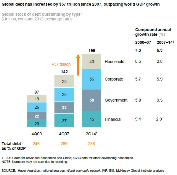 A recent report by the consultancy McKinsey highlights how much the world has not deleveraged since the onset of the financial crisis. Many newspapers have jumped on the occasion to question whether or not the policies adopted since the crisis were the right ones (FT, Telegraph, The Economist…). This is how the total stock of debt has evolved since 2000: