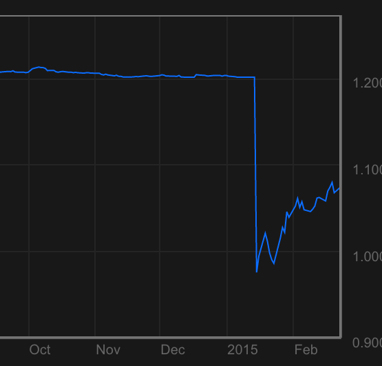 The following graph shows that the SF has fallen from rough parity with the euro after the de-pegging, to about 1.08 SF to the euro today: