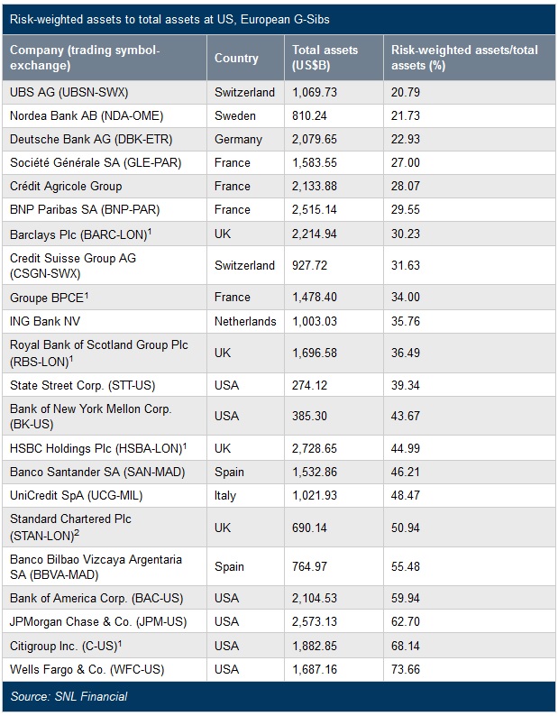 PS: Some of you might be surprised by this table compiled by Euromoney/SNL, which clearly shows that European banks use ridiculously low average risk-weights on their assets compared to their American peers: