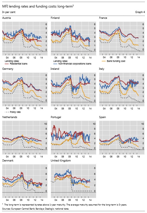 **To be clear, when funding cost does not fall as much as central bank’s base rates, it’s often the case that compression has been achieved (i.e. liabilities have reached the zero-lower bound, or close). When funding costs do fall (almost) as much as base rates, but the spread between lending rates and funding costs is widening, it often means that the risk premium is increasing (such as in Spain, Ireland or Italy).