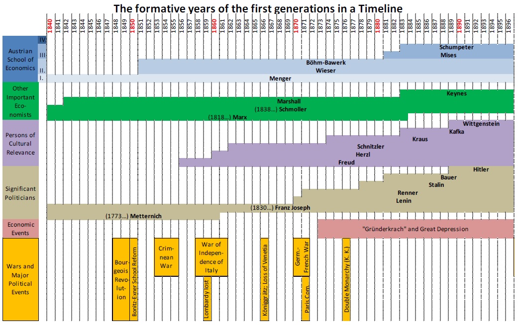 The disintegration of the empire following WW1, the hyperinflation experience, the rise of socialism and later the Great Depression reinforced this individualistic, anti-state intervention trend and led to the dynamic capital, entrepreneurial, business cycle, market structure, knowledge and law theories (all very laissez-faire) of Ludwig von Mises, Joseph Schumpeter and Friedrich Hayek. Nowotny very usefully summed up the historical events using the two following timelines: