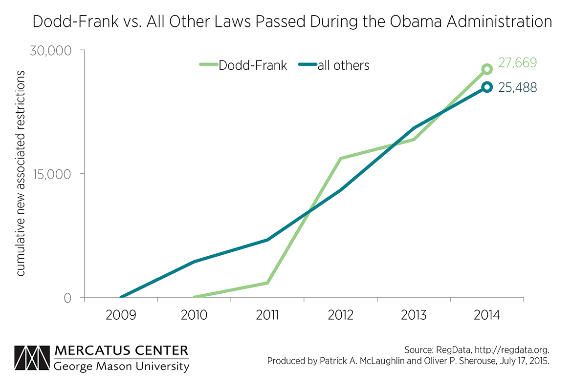 Meanwhile, the McLaughin and Sherouse from the Mercatus Center of George Mason University published a new blog post pointing out that Dodd-Frank “may be the biggest law ever”. They came up with stupefying data: Dodd-Frank actually comprises more restrictions than… all the other laws passed during the Obama administration: