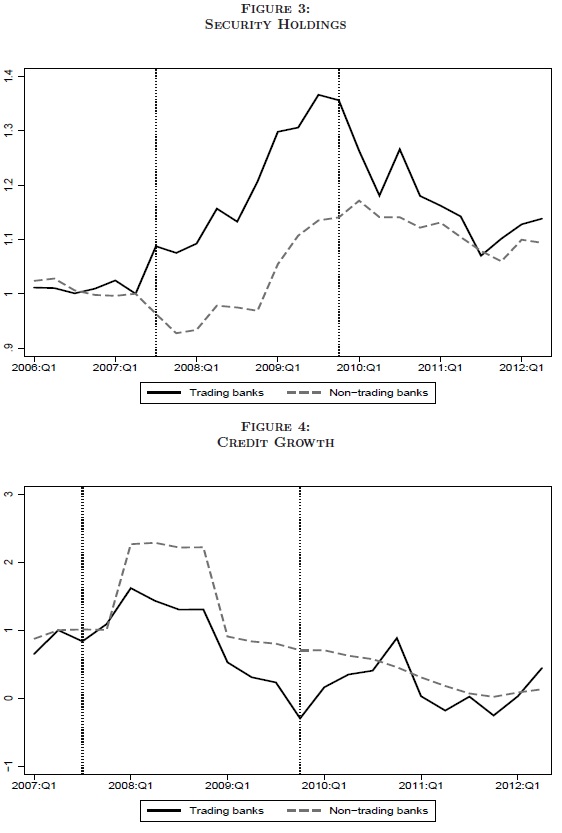 But that’s not it. Some Bundesbank staff members also just published a new research paper titled Securities trading by banks and credit supply: micro-evidence, which attempted to understand the implications of variations in trading activity on the supply of credit to the economy. In theory (simplified loanable funds model), banks have only one resource pool (= reserves) to use on two possible options: lending to customers or buying securities*. In a world of scarce resources, increasing one should decrease the second. However, endogenous money theorists would say that this dichotomy is a myth; that banks are not constrained by the availability of reserves and hence can expand both activities at the same time as long as it makes economic sense. According to them, the only real constraints on banks are regulatory ones such as minimum capital requirements.